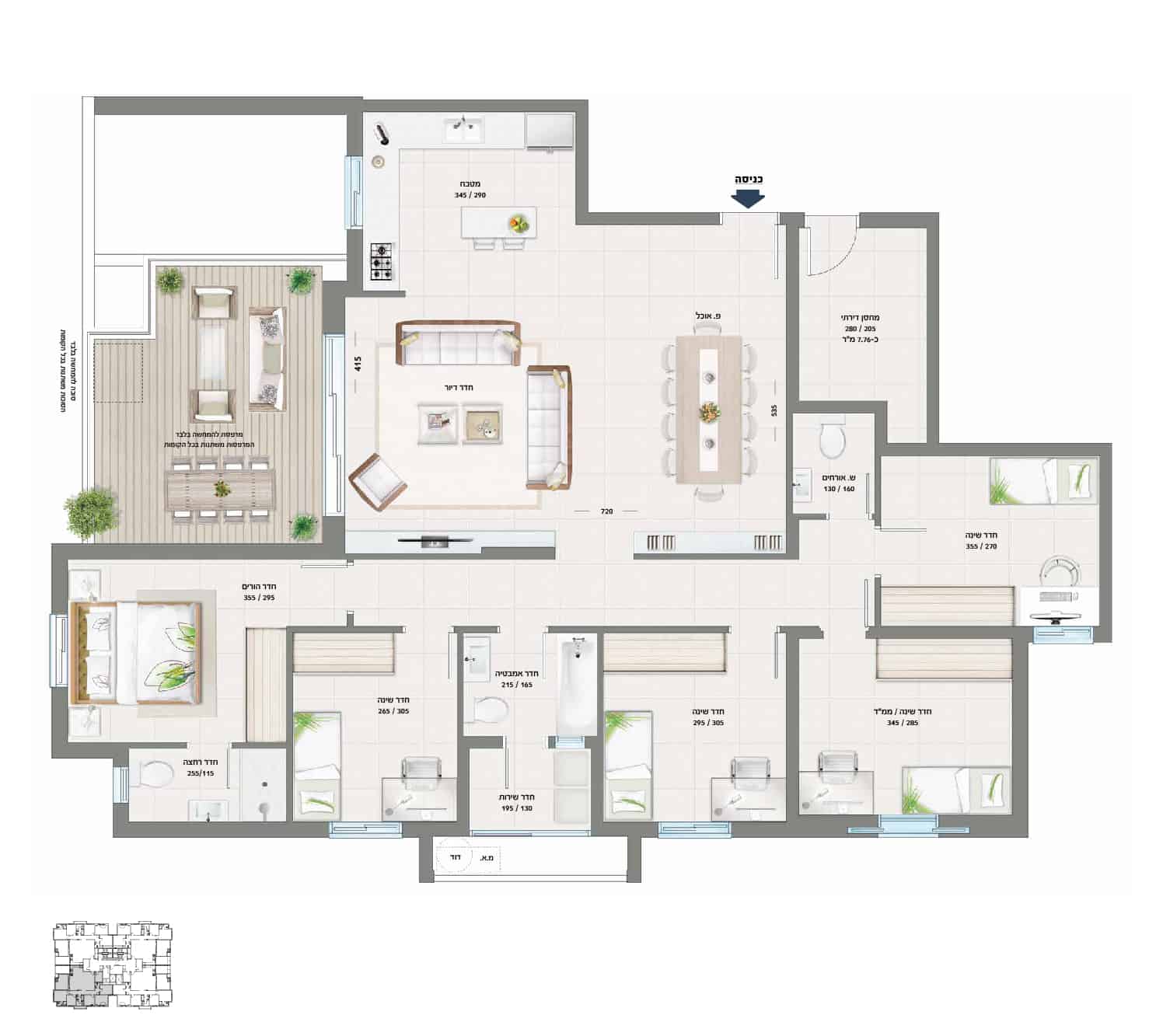 מרבית הדירות בפרויקט הינן בנות 6 חדרים, כוללות מחסן דירתי צמוד, מרפסות נרחבות וסוכות, וממוקמות מול נוף מרהיב. זאת מלבד דירות פנטהאוז ודופלקסים. בעורף המגדל מתוכננת גינה משחקים ירוקה ורחבת ידיים, אליה יוכלו ילדיכם לרדת בביטחון מלא, בלא צורך בחציית כבישים ובסביבה בטוחה בעלת אופי קהילתי.
